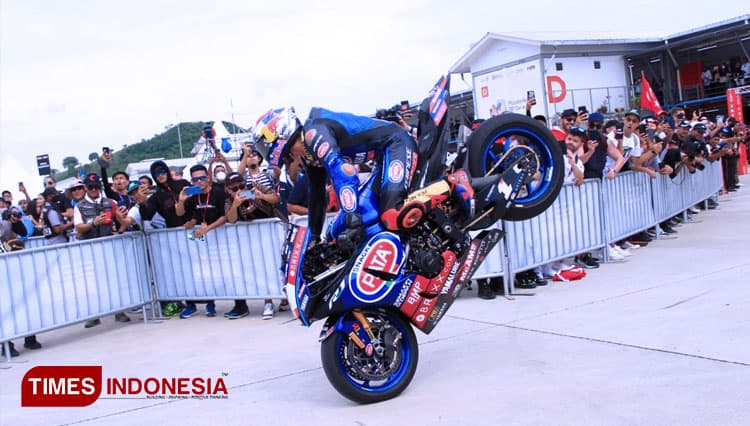 TIMES Sumsel/Pembalap PATA Yamaha Brixx Toprak Razgatlioglu melakukan atraksi stopie ban depan usai memenangi race 1 WSBK Mandalika 2022, Sabtu (12/11/2022). (FOTO: Tria Adha/TIMES Indonesia).