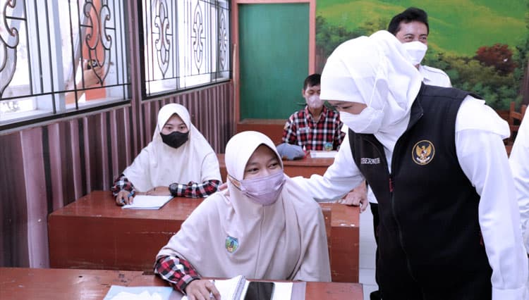 TIMES Sumsel/Gubernur Khofifah saat meninjau PTM terbatas. (FOTO: Dok.Humas Pemprov Jatim)