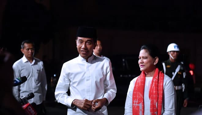 TIMES Sumsel/Capres nomor urut 01 Joko Widodo bersama istri Iriana Joko Widodo tiba di lokasi untuk mengikuti debat Pilpres 2019 putaran kelima, di Hotel Sultan, Jakarta, Sabtu (13/4/2019). (FOTO: Rivan Awal Lingga/Antarafoto)