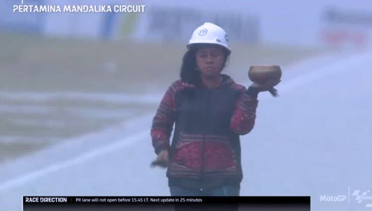 TIMES Sumsel/Raden Rara Isti Wulandari, sang pawang hujan saat Sirkuit Mandalika, Lombok Tengah, NTB, Minggu (20/3/2022) (FOTO: t-2.tstatic.net)