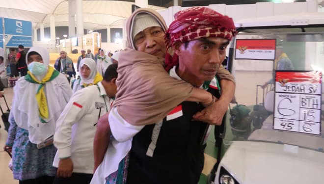 TIMES Sumsel/Petugas PPIH menggendong jemaah risti di bandara KAIA Jeddah, jelang pulang ke tanah air. (FOTO : istimewa).